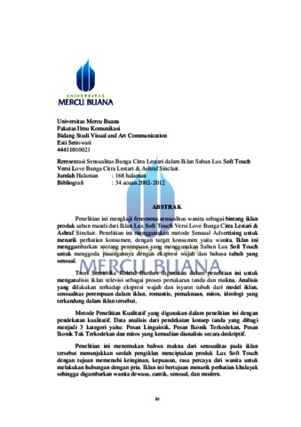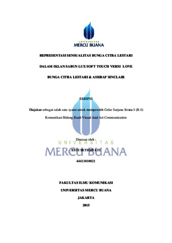 Setiowati, Esti (2015) REPRESENTASI SENSUALITAS BUNGA CITRA LESTARI DALAM IKLAN SABUN LUX SOFT TOUCH VERSI LOVE BUNGA CITRA LESTARI & ASHRAF SINCLAIR. S1 thesis, Universitas Mercu Buana.