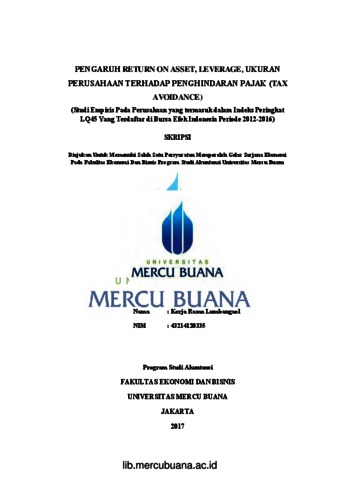 LUMBANGAOL, KERJA RAMA (2017) PENGARUH RETURN ON ASSET, LEVERAGE, UKURAN PERUSAHAAN TERHADAP PENGHINDARAN PAJAK (TAX AVOIDANCE) (Studi Empiris Pada Perusahaan yang termasuk dalam Indeks Peringkat LQ45 Yang Terdaftar di Bursa Efek Indonesia Periode 2012-2016). S1 thesis, Universitas Mercu Buana Jakarta.
