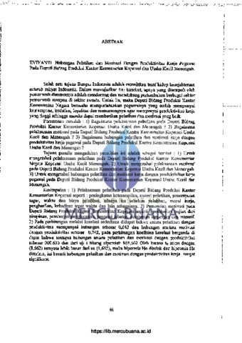 EVIYANTI. Hubungan Pelatihan dan Motivasi Dengan Produktivitas Kerja Pegawai Pada Deputi Bidang Produksi Kantor Kementerian Koperasi dan Usaha Kecil Menengah. Salah satu tujuan Bangsa Indonesia adalah menaikkan taraf hidup kesejahteraan seluruh rakyat Indonesia. Dalam mewujudkan hal tersebut, upaya yang ditempuh oleh pemerintah diantaranya adalah mendorong dan mendukung pertumbuhan berbagai sektor pemerintah maupun di sektor swasta. Untuk itu, maka Deputi Bidang Produksi Kantor Kementerian Negara berusaha mempertahankan pegawainya yang sudah mempunyai kemampuan, keahlian, loyalitas dan mendorongnya agar mempunyai produktivitas kerja yang tinggi sehingga mereka dapat memberikan pelatihan dan motivasi yang baik. Perumusan masalah: 1) Bagaimana pelaksanaan pelatihan pada Deputi Bidang Produksi Kantor Kementerian Koperasi Usaha Kecil dan Menengah ? 2) Bagaimana pelaksanaan motivasi pada Deputi Bidang Produksi Kantor Kementerian Koperasi Usaha Kecil dan Menengah ? 3) Bagaimana hubungan pelatihan dan motivasi kerja dengan produktivitas kerja pegawai pada Deputi Bidang Produksi Kantor Kementerian Koperasi Usaha Kecil dan Menengah? Tujuan penulis mengadakan penelitian ini adalah sebagai berikut: 1) Untuk mengetahui pelaksanaan pelatihan pada Deputi Bidang Produksi Kantor Kementerian Negara Koperasi Usaha Kecil Menengah. 2) Untuk mengetahui pelaksanaan motivasi pada Deputi Bidang Produksi Kantor Kementerian Koperasi Usaha Kecil dan Menengah. 3) Untuk mengetahui hubungan pelatihan dan motivasi kerja dengan produktivitas kerja pegawai pada Deputi Bidang Produksi Kantor Kementerian Koperasi Usaha Kecil dan Menengah. Kesimpulan 1) Pelaksanaan pelatihan pada Depati Bidang Produksi Kantor Kementerian Koperasi seperti: peningkatan keterampilan, materi pelatihan, penempatan tugas, waktu dan biaya pelatihan, adanya tes sebelum pelatihan, moral kerja, penghasilan, kehadiran tepat waktu dan lain sebagainya. 2) Pemberian motivasi pada Deputi Bidang Produksi Kantor Kementerian Koperasi seperti: pemberian pujian dari pimpinan, pemberian penghargaan, promosi jabatan, pemberian tunjangan dan intensif. 3) Pada perhitungan melalui korelasi sederhana didapat bahwa antara pelatihan dengan produktivitas mempunyai hubungan sebesar 0,643 dan hubungan anatara motivasi dengan produktivitas sebesar 0,742, pada perhitungan koefisien korelasi berganda di dapat bahwa terdapat hubungan antara pelatihan dan motivasi dengan produktivitas sebesar 000.653 dan dari uji t hitung diperoleh 888,662 Oleh karena to sama dengan (8,662) ternyata lebih besar dari to (1,645), maka hipotesis Ho ditolak dan hipotesis Ha diterima, ini berarti hubungan pelatihan dan motivasi dengan produktivitas kerja sangat significant.