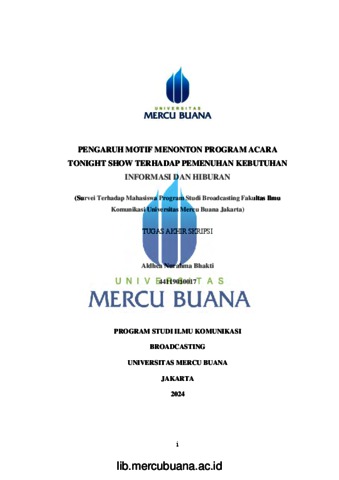 BHAKTI, ALDHEA NURAHMA (2024) PENGARUH MOTIF MENONTON PROGRAM ACARA TONIGHT SHOW TERHADAP PEMENUHAN KEBUTUHAN INFORMASI DAN HIBURAN (Survei Terhadap Mahasiswa Program Studi Broadcasting Fakultas Ilmu Komunikasi Universitas Mercu Buana Jakarta). S1 thesis, Universitas Mercu Buana Jakarta.