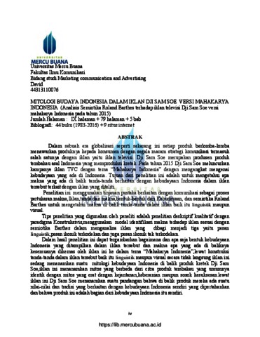 Dalam sebuah era globalisasi seperti sekarang ini setiap produk berlomba-lomba menawarkan produknya kepada konsumen dengan segala macam strategi komunikasi termasuk salah satunya dengan iklan yaitu iklan televisi. Dji Sam Soe merupakan produsen produk tembakau asal Indonesia yang memproduksi kretek .Pada tahun 2015 Dji Sam Soe meluncurkan kampanye iklan TVC dengan tema “Mahakarya Indonesia” dengan mengangkat mengenai kebudayaan yang ada di Indonesia. Tujuan dari penelitian ini adalah untuk mengetahui apa makna yang ada di balik tanda-tanda berkaitan dengan kebudayaan Indonesia dalam iklan tersebut terkait dengan iklan yang diteliti. Penelitian ini menggunakan tinjauan pustaka berkaitan dengan komunikasi sebagai proses pertukaran makna,Iklan,tanda dan makna,bentuk-bentuk dari Kebudayaan, dan semiotika Roland Barthes untuk mengetahui makna di balik tanda-tanda dalam iklan baik itu linguistik maupun visual. Tipe penelitian yang digunakan oleh peneliti adalah penelitian deskriptif kualitatif dengan paradigma Konstruksivis,menggunakan model identifikasi makna terhadap iklan sesuai dengan semiotika Barthes dalam menganalisa iklan yang dibagi menjadi tiga yaitu pesan linguistik,pesan ikonik terkodekan dan juga pesan ikonik tak terkodekan. Dalam hasil penelitian ini dapat tergambarkan bagaimana dan apa saja bentuk kebudayaan Indonesia yang ditampilkan dalam iklan tersebut dan makna apa yang ada di baliknya kesemuanya dikemas oleh iklan ini ke dalam tema “Mahakarya Indonesia”,lewat konstruksi tanda-tanda dalam iklan tersebut baik itu linguistik maupun visual secara tidak langsung iklan ini sedang menanamkan suatu mitologi kebudayaan Indonesia di balik produk kretek Dji Sam Soe,iklan ini menanamkan mitos yang berbeda dari citra produk tembakau yang umumnya identik dengan mitos yang erat dengan kejantanan,keberanian maupun sosok kesuksesan.lewat iklan ini Dji Sam Soe menanamkan suatu pandangan bahwa di balik produk mereka ada suatu nilai-nilai dan tradisi yang berkaitan dengan kebudayaan Indonesia sendiri yang dipertahankan dan bahwa produk ini adalah bagian dari kebudayaan Indonesia itu sendiri.
