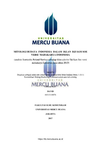 DAVID, DAVID (2017) MITOLOGI BUDAYA INDONESIA DALAM IKLAN DJI SAM SOE VERSI MAHAKARYA INDONESIA (analisis Semiotika Roland Barthes terhadap iklan televisi Dji Sam Soe versi mahakarya Indonesia pada tahun 2015). S1 thesis, Universitas Mercu Buana Jakarta.