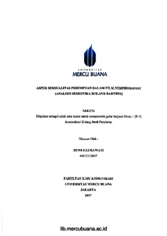 FATMAWATI, DEWI (2017) ASPEK SEKSUALITAS PEREMPUAN DALAM FILM NYMPHOMANIAC (ANALISIS SEMIOTIKA ROLAND BARTHES). S1 thesis, Universitas Mercu Buana Jakarta.
