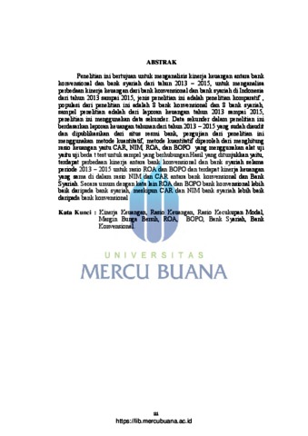 This study aims to: (1) Analyze financial performance of Conventional Bank and Islamic Bank during 2013 until 2015 (2) to analyze the differences in the financial performance of conventional banks and Islamic banks in Indonesia for period 2013 – 2015 This research is a kind of comparative research. Population in this research is eight Islamic and eight Conventional banks . The sample in this research is financial statements from 2013-2015 This study uses secondary data. Secondary data in this study were obtained from the annual financial report on during the period 2013-2015 that has been audited and publicized to the public via the official website of the banks, This research assessment system uses a quantitative approach. Quantitative approach carried out by calculating financial ratios and the ratios are CAR, NIM, ROA, And BOPO which is then followed by different test by using statistical test Paired Sample t - Test. The results showed that there were significant differences in financial performance between conventional banks and Islamic banks during the period 2013-2015, for ROA and BOPO ratios. And same financial performance for NIM and CAR ratios on Conventional Bank and Islamic bank. Penelitian ini bertujuan untuk menganalisis kinerja keuangan antara bank konvensional dan bank syariah dari tahun 2013 – 2015, untuk menganalisa perbedaan kinerja keuangan dari bank konvensional dan bank syariah di Indonesia dari tahun 2013 sampai 2015, jenis penelitian ini adalah penelitian komparatif , populasi dari penelitian ini adalah 8 bank konvensional dan 8 bank syariah, sampel penelitian adalah dari laporan keuangan tahun 2013 sampai 2015, penelitian ini menggunakan data sekunder. Data sekunder dalam penelitian ini berdasarkan laporan keuangan tahunan dari tahun 2013 – 2015 yang sudah diaudit dan dipublikasikan dari situs resmi bank, pengujian dari penelitian ini menggunakan metode kuantitatif, metode kuantitatif diperoleh dari menghitung rasio keuangan yaitu CAR, NIM, ROA, dan BOPO yang menggunakan alat uji yaitu uji beda t test untuk sampel yang berhubungan.Hasil yang ditunjukkan yaitu, terdapat perbedaan kinerja antara bank konvensional dan bank syariah selama periode 2013 – 2015 untuk rasio ROA dan BOPO dan terdapat kinerja keuangan yang sama di dalam rasio NIM dan CAR antara bank konvensional dan Bank Syariah. Secara umum dengan kata lain ROA dan BOPO bank konvensional lebih baik daripada bank syariah, meskipun CAR dan NIM bank syariah lebih baik daripada bank konvensional