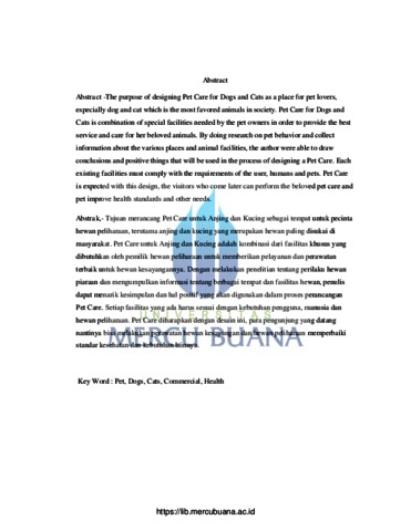 The purpose of designing Pet Care for Dogs and Cats as a place for pet lovers, especially dog and cat which is the most favored animals in society. Pet Care for Dogs and Cats is combination of special facilities needed by the pet owners in order to provide the best service and care for her beloved animals. By doing research on pet behavior and collect information about the various places and animal facilities, the author were able to draw conclusions and positive things that will be used in the process of designing a Pet Care. Each existing facilities must comply with the requirements of the user, humans and pets. Pet Care is expected with this design, the visitors who come later can perform the beloved pet care and pet improve health standards and other needs. Tujuan merancang Pet Care untuk Anjing dan Kucing sebagai tempat untuk pecinta hewan peliharaan, terutama anjing dan kucing yang merupakan hewan paling disukai di masyarakat. Pet Care untuk Anjing dan Kucing adalah kombinasi dari fasilitas khusus yang dibutuhkan oleh pemilik hewan peliharaan untuk memberikan pelayanan dan perawatan terbaik untuk hewan kesayangannya. Dengan melakukan penelitian tentang perilaku hewan piaraan dan mengumpulkan informasi tentang berbagai tempat dan fasilitas hewan, penulis dapat menarik kesimpulan dan hal positif yang akan digunakan dalam proses perancangan Pet Care. Setiap fasilitas yang ada harus sesuai dengan kebutuhan pengguna, manusia dan hewan peliharaan. Pet Care diharapkan dengan desain ini, para pengunjung yang datang nantinya bisa melakukan perawatan hewan kesayangan dan hewan peliharaan memperbaiki standar kesehatan dan kebutuhan lainnya.