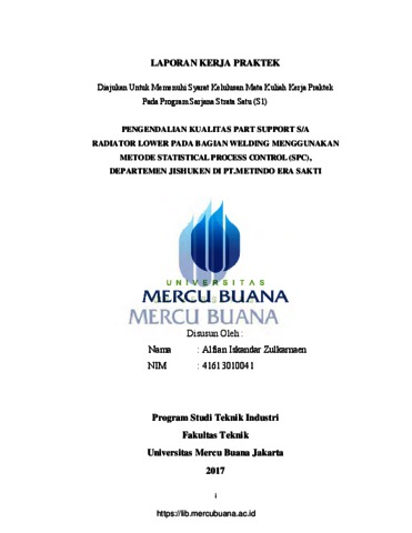 ZULKARNAEN, ALFIAN ISKANDAR (2017) PENGENDALIAN KUALITAS PART SUPPORT S/A RADIATOR LOWER PADA BAGIAN WELDING MENGGUNAKAN METODE STATISTICAL PROCESS CONTROL (SPC), DEPARTEMEN JISHUKEN DI PT.METINDO ERA SAKTI. S1 thesis, Universitas Mercu Buana Jakarta.