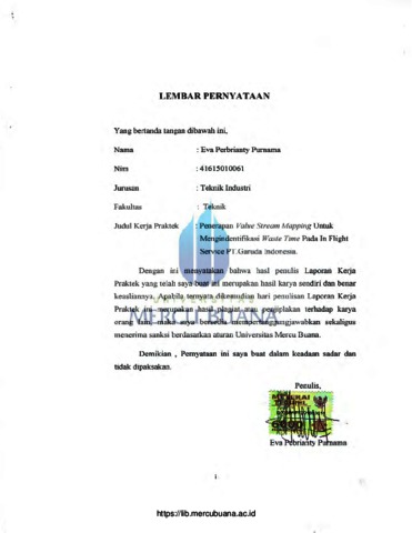PURNAMA, EVA PEBRIANTY (2018) Penggunaan Value Stream Mapping Untuk Mengindentifikasi Waste Time Pada In Flight Service PT.Garuda Indonesia. S1 thesis, Universitas Mercu Buana Jakarta.