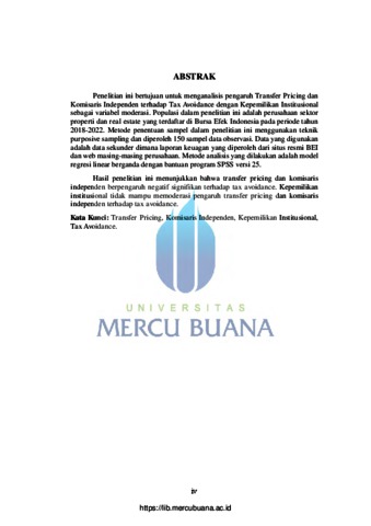 AUDRI, ANNISA NURUL (2024) PENGARUH TRANSFER PRICING DAN KOMISARIS INDEPENDEN TERHADAP TAX AVOIDANCE DENGAN KEPEMILIKAN INSTITUSIONAL SEBAGAI VARIABEL MODERASI. S1 thesis, Universitas Mercu Buana Jakarta.