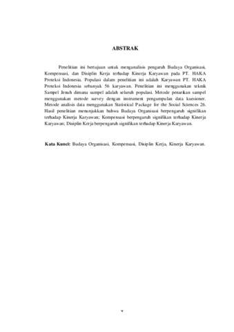 Penelitian ini bertujuan untuk menganalisis pengaruh Budaya Organisasi, Kompensasi, dan Disiplin Kerja terhadap Kinerja Karyawan pada PT. HAKA Proteksi Indonesia. Populasi dalam penelitian ini adalah Karyawan PT. HAKA Proteksi Indonesia sebanyak 56 karyawan. Penelitian ini menggunakan teknik Sampel Jenuh dimana sampel adalah seluruh populasi. Metode penarikan sampel menggunakan metode survey dengan instrument pengumpulan data kuesioner. Metode analisis data menggunakan Statistical Package for the Social Sciences 26. Hasil penelitian menunjukkan bahwa Budaya Organisasi berpengaruh signifikan terhadap Kinerja Karyawan; Kompensasi berpengaruh signifikan terhadap Kinerja Karyawan; Disiplin Kerja berpengaruh signifikan terhadap Kinerja Karyawan.