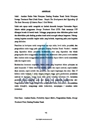 Salah satu upaya untuk mengolah air limbah domestik kampus Universitas Negeri Jakarta adalah penggunaan Sewage Treatment Plant (STP). Pada umumnya STP dibangun berada di bawah tanah. Sehingga pengerjaanya akan dilakukan galian tanah dan dibutuhkan pula dinding penahan tanah untuk mecegah adanya longsoran. Masing masing kegiatan memiliki tingkat risiko yang berbeda, tergantung pada jenis kegiatan yang dilakukan. Penelitian ini bertujuan untuk mengetahui apa saja risiko, level risiko, penyebab, dan pengendalian risiko tinggi pada pekerjaan Dinding Penahan Tanah. Variabel - variabel yang digunakan dalam penelitian berdasarkan teori yang digunakan dan teknik pengumpulan data menggunakan kuesioner dan wawancara (data primer) serta analisis data. Analisis risiko menggunakan metode Probability Impact Matrix untuk menentukan nilai dan tingkat risiko. Berdasarkan kuesioner responden, faktor risiko yang berpotensi dalam pekerjaan ini yaitu berjumlah 57 faktor dalam 4 variabel, terdiri dari aspek material, aspek sumber daya manusia, aspek metode dan peralatan, dan aspek lingkungan dan alam. Dari 57 kriteria risiko terdapat 5 risiko dengan kategori tinggi yaitu pemborosan pemakaian material di lapangan, tenaga kerja tidak patuh terhadap ketentuan K3, kerusakan peralatan kerja, kesalahan pada saat desain, dan rendahnya produktivitas alat. Pengendalian risiko tinggi dengan cara menghindari risiko (avoidance), memindahkan risiko (transfer), mengurangi risiko (reduction), menyimpan / menahan risiko (retention). Kata Kunci : Analisis Risiko, Probability Impact Matrix, Pengendalian Risiko, Sewage