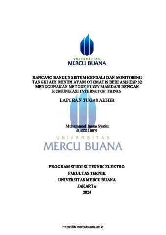 SYAFEI, MUHAMMAD IMAM (2024) RANCANG BANGUN SISTEM KENDALI DAN MONITORING TANGKI AIR MINUM AYAM OTOMATIS BERBASIS ESP 32 MENGGUNAKAN METODE FUZZY MAMDANI DENGAN KOMUNIKASI INTERNET OF THINGS. S1 thesis, Universitas Mercu Buana Jakarta.