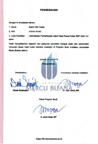 IRIANTO, SATRIO ALIM (2018) OPTIMALISASI PENCAHAYAAN ALAMI PADA RUANG KELAS SMP ISLAM AZ-ZAMIR. S1 thesis, Universitas Mercu Buana Jakarta.