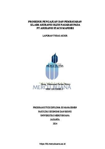 OKTORY, MUHAMMAD FARHAN (2024) PROSEDUR PENGAJUAN DAN PEMBAYARAN KLAIM ASURANSI OLEH NASABAH PADA PT ASURANSI STACO MANDIRI. D3 thesis, Universitas Mercu Buana Jakarta.