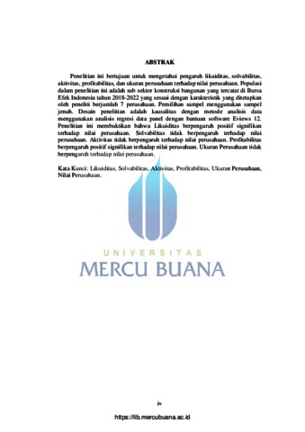 ANDINI, SEFI (2024) PENGARUH LIKUIDITAS, SOLVABILITAS, AKTIVITAS, PROFITABILITAS DAN UKURAN PERUSAHAAN TERHADAP NILAI PERUSAHAAN (Studi Pada Perusahaan Sub Sektor Konstruksi Bangunan Yang Tercatat Di Bursa Efek Indonesia Periode 2018-2022). S1 thesis, Universitas Mercu Buana Jakarta.