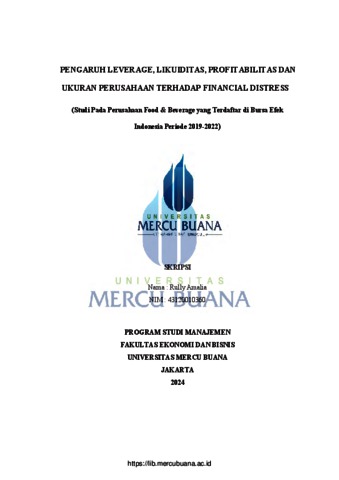 AMALIA, RULLY (2024) PENGARUH LEVERAGE, LIKUIDITAS, PROFITABILITAS DAN UKURAN PERUSAHAAN TERHADAP FINANCIAL DISTRESS (Studi Pada Perusahaan Food & Beverage yang Terdaftar di Bursa Efek Indonesia Periode 2019-2022). S1 thesis, Universitas Mercu Buana Jakarta.