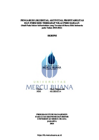 MEGANANDA, MARIO (2024) PENGARUH LIKUIDITAS, AKTIVITAS, PROFITABILITAS DAN FIRM SIZE TERHADAP NILAI PERUSAHAAN (Studi Pada Sektor Infrastruktur yang Tercatat di Bursa Efek Indonesia pada Tahun 2018-2022). S1 thesis, Universitas Mercu Buana Jakarta.