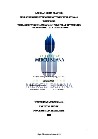 FAHMI, MUHAMMAD (2018) PEMBANGUNAN PROYEK GEDUNG TOWER WEST SENAYAN TANGERANG “PENGARUH PENGGUNAAN SHORING PADA PELAT BETON UNTUK MENGHINDARI CACAT PADA BETON”. S1 thesis, Universitas Mercu Buana Jakarta.