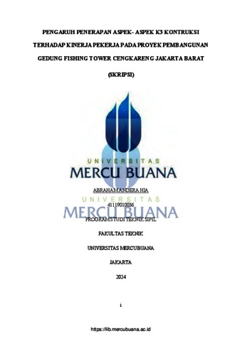 HIA, ABRAHAM ANDERA (2024) PENGARUH PENERAPAN ASPEK- ASPEK K3 KONTRUKSI TERHADAP KINERJA PEKERJA PADA PROYEK PEMBANGUNAN GEDUNG FISHING TOWER CENGKARENG JAKARTA BARAT. S1 thesis, Universitas Mercu Buana.