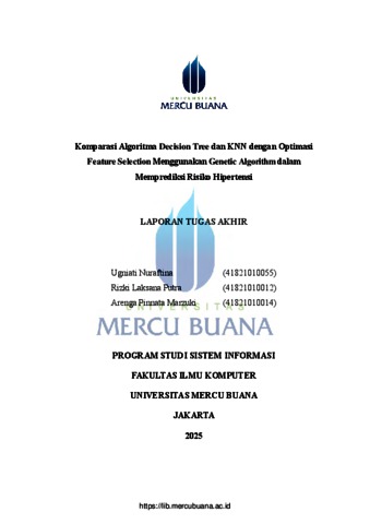 NURAFTINA, UGNIATI (2025) KOMPARASI ALGORITMA DECISION TREE DAN KNN DENGAN OPTIMASI FEATURE SELECTION MENGGUNAKAN GENETIC ALGORITHM DALAM MEMPREDIKSI RISIKO HIPERTENSI. S1 thesis, Universitas Mercu Buana Jakarta.