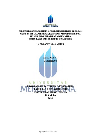NALWI, AGIL (2025) PERBANDINGAN ALGORITMA K-NEAREST NEIGHBORS (KNN) DAN NAIVE BAYES DALAM MENGKLASIFIKASI PEMAHAMAN SISWA KELAS X PADA PELAJARAN MATEMATIKA (STUDI KASUS SMK AL-HADIID 1 CILEUNGSI). S1 thesis, Universitas Mercu Buana - Buncit.