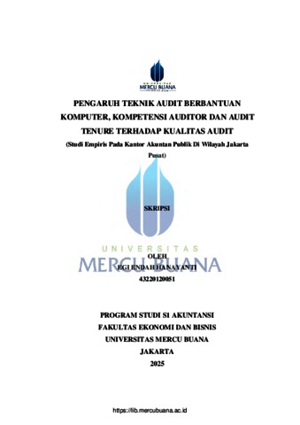 HANAYANTI, EGI ENDAH (2025) PENGARUH TEKNIK AUDIT BERBANTUAN KOMPUTER, KOMPETENSI AUDITOR DAN AUDIT TENURE TERHADAP KUALITAS AUDIT (Studi Empiris Pada Kantor Akuntan Publik Di Wilayah Jakarta Pusat). S1 thesis, Universitas Mercu Buana Jakarta.