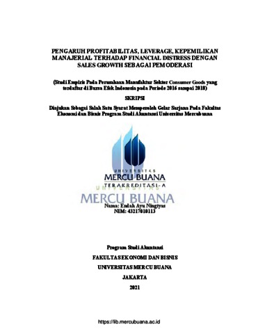 NINGTYAS, ENDAH AYU (2021) PENGARUH PROFITABILITAS, LEVERAGE, KEPEMILIKAN MANAJERIAL TERHADAP FINANCIAL DISTRESS DENGAN SALES GROWTH SEBAGAI PEMODERASI (Studi Empiris Pada Perusahaan Manufaktur Sektor Consumer Goods yang terdaftar di Bursa Efek Indonesia pada Periode 2016 sampai 2018). S1 thesis, Universitas Mercu Buana Jakarta.