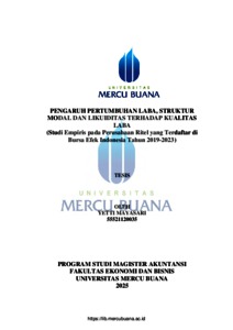 MAYASARI, YETTI (2025) PENGARUH PERTUMBUHAN LABA, STRUKTUR MODAL DAN LIKUIDITAS TERHADAP KUALITAS LABA (Studi Empiris pada Perusahaan Ritel yang Terdaftar di Bursa Efek Indonesia Tahun 2019-2023). S2 thesis, Universitas Mercu Buana Jakarta.