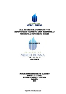 AULIA, VIKI SRI (2025) ANALISIS KELAYAKAN JARINGAN FTTH MENGGUNAKAN TEKNOLOGI GPON BERDASARKAN PERHITUNGAN POWER LINK BUDGET. S1 thesis, Universitas Mercu Buana.