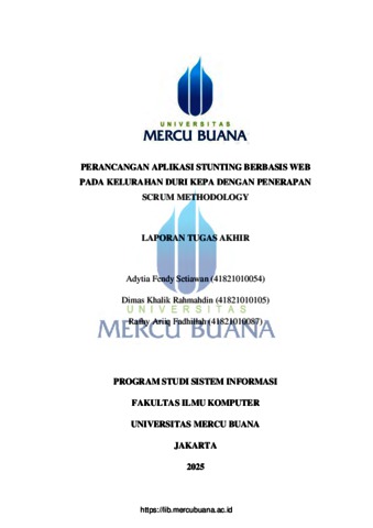 SETIAWAN, ADYTIA FENDY (2025) PERANCANGAN APLIKASI STUNTING BERBASIS WEB PADA KELURAHAN DURI KEPA DENGAN PENERAPAN SCRUM METHODOLOGY. S1 thesis, Universitas Mercu Buana Jakarta.