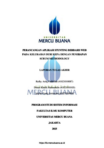 FADHILLAH, RAFHY ARIIQ (2025) PERANCANGAN APLIKASI STUNTING BERBASIS WEB PADA KELURAHAN DURI KEPA DENGAN PENERAPAN SCRUM METHODOLOGY. S1 thesis, Universitas Mercu Buana Jakarta.