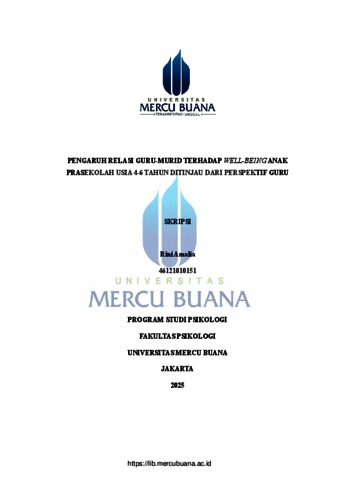 AMALIA, RINI (2025) PENGARUH RELASI GURU-MURID TERHADAP WELL-BEING ANAK PRASEKOLAH USIA 4-6 TAHUN DITINJAU DARI PERSPEKTIF GURU. S1 thesis, Universitas Mercu Buana Jakarta.