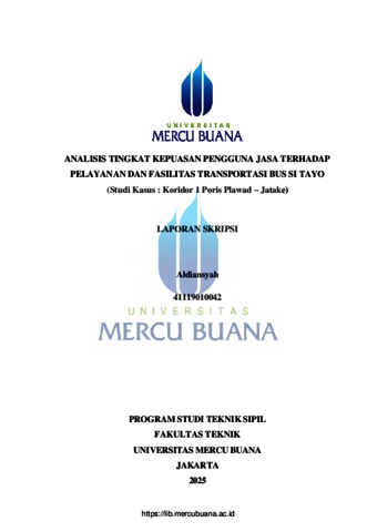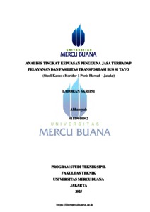 ALDIANSYAH, ALDIANSYAH (2025) ANALISIS TINGKAT KEPUASAN PENGGUNA JASA TERHADAP PELAYANAN DAN FASILITAS TRANSPORTASI BUS SI TAYO (Studi Kasus : Koridor 1 Poris Plawad - Jatake). S1 thesis, Universitas Mercu Buana Jakarta.