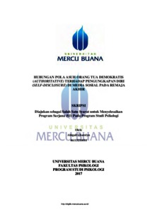 CHAROLYN, ABIGAIL (2017) HUBUNGANPOLA ASUH ORANG TUADEMOKRATIS (AUTHORITATIVE) TERHADAPPENGUNGKAPAN DIRI (SELF-DISCLOSURE) DI MEDIA SOSIALPADA REMAJA AKHIR. S1 thesis, UNIVERISTAS MERCU BUANA - BUNCIT.