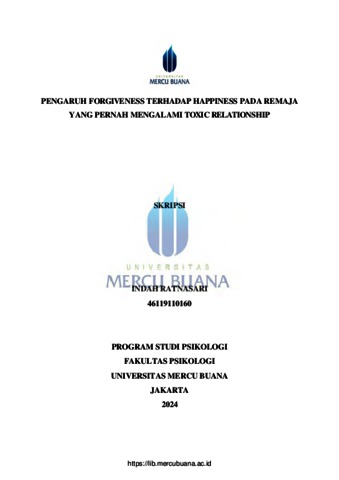 RATNASARI, INDAH (2025) PENGARUH FORGIVENESS TERHADAP HAPPINESS PADA REMAJA YANG PERNAH MENGALAMI TOXIC RELATIONSHIP. S1 thesis, Universitas Mercu Buana.