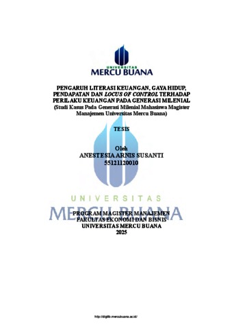 SUSANTI, ANESTESIA ARNIS (2025) PENGARUH LITERASI KEUANGAN, GAYA HIDUP, PENDAPATAN DAN LOCUS OF CONTROL TERHADAP PERILAKU KEUANGAN PADA GENERASI MILENIAL (Studi Kasus Pada Generasi Milenial Mahasiswa Magister Manajemen Universitas Mercu Buana). S2 thesis, UNIVERSITAS MERCU BUANA - BUNCIT.
