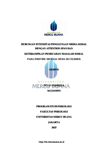 FAHREZA, IFVAN (2025) HUBUNGAN INTENSITAS PENGGUNAAN MEDIA SOSIAL DENGAN ATTENTION SPAN DAN KETERAMPILAN PEMECAHAN MASALAH SOSIAL PADA INDIVIDU DEWASA MUDA DI CILEDUG. S1 thesis, Universitas Mercu Buana.