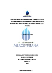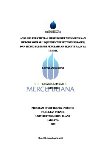 SULASISYAH, LISA (2025) ANALISIS EFEKTIVITAS MESIN BUBUT MENGGUNAKAN METODE OVERALL EQUIPMENT EFFECTIVENESS (OEE) DAN SIX BIG LOSSES DI PERUSAHAAN SEJAHTERA JAYA TEKNIK. S1 thesis, Universitas Mercu Buana Jakarta.