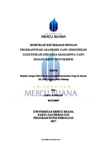 FADHILAH, LUBNA (2017) HUBUNGAN KECEMASAN DENGAN PROKRASTINASI AKADEMIK YANG DIMODERASI OLEH EFIKASI DIRI PADA MAHASISWA YANG SEDANG MENYUSUN SKRIPSI. S1 thesis, UNIVERSITAS MERCU BUANA - BUNCIT.