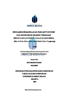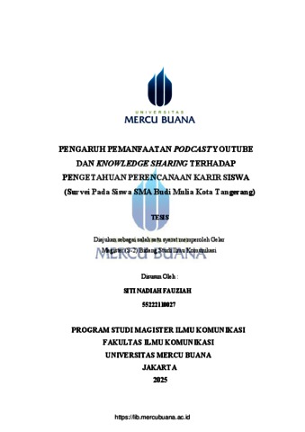 FAUZIAH, SITI NADIAH (2025) PENGARUH PEMANFAATAN PODCAST YOUTUBE DAN KNOWLEDGE SHARING TERHADAP PENGETAHUAN PERENCANAAN KARIR SISWA (Survei Pada Siswa SMA Budi Mulia Kota Tangerang). S2 thesis, Universitas Mercu Buana.