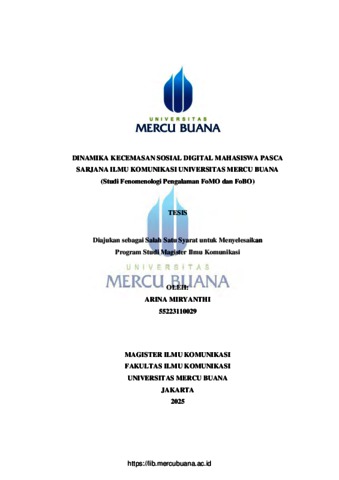 MIRYANTHI, ARINA (2025) DINAMIKA KECEMASAN SOSIAL DIGITAL MAHASISWA PASCA SARJANA ILMU KOMUNIKASI UNIVERSITAS MERCU BUANA (Studi Fenomenologi Pengalaman FoMO dan FoBO). S2 thesis, Universitas Mercu Buana.