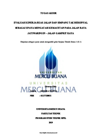 NOVITA, DEBORA (2019) EVALUASI KINERJA RUAS JALAN DAN SIMPANG TAK BERSINYALSEBAGAI UPAYA MENGATASI KEMACETAN PADA JALAN RAYA JATIWARINGIN – JALAN GAMPRIT RAYA. S1 thesis, UNIVERISTAS MERCU BUANA - BUNCIT.