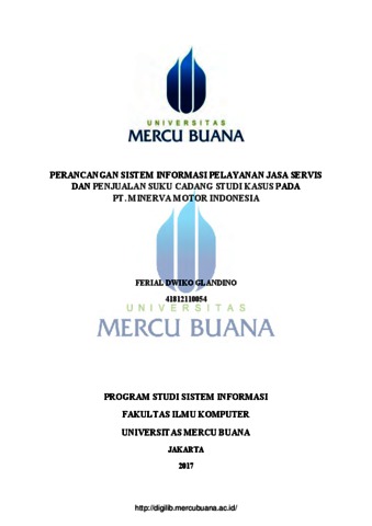GLANDINO, FERIAL DWIKO (2017) PERANCANGAN SISTEM INFORMASI PELAYANAN JASA SERVIS DAN PENJUALAN SUKU CADANG STUDI KASUS PADA PT. MINERVA MOTOR INDONESIA. S1 thesis, Universitas Mercu Buana Jakarta.