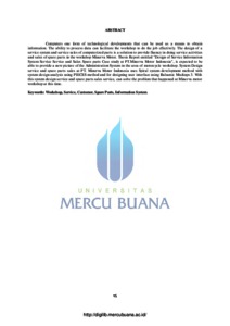Computers one form of technological developments that can be used as a means to obtain information. The ability to process data can facilitate the workshop to do the job effectively. The design of a service system and service sales of computerized parts is a solution to provide fluency in doing service activities and sales of spare parts in the workshop Minerva Motor. Thesis Report entitled "Design of Service Information System Service Service and Sales Spare parts Case study at PT.Minerva Motor Indonesia", is expected to be able to provide a new picture of the Administration System in the area of motorcycle workshop. System Design service and spare parts sales at PT. Minerva Motor Indonesia uses Spiral system development method with system design analysis using PIECES method and for designing user interface using Balsamic Mockups 3. With this system design service and spare parts sales service, can solve the problem that happened at Minerva motor workshop at this time. Keywords: Workshop, Service, Customer, Spare Parts, Information System. Komputer salah satu bentuk perkembangan teknologi yang dapat dijadikan sarana untuk mendapatkan informasi. Kemampuan mengolah data dapat memudahkan bengkel melakukan pekerjaan secara efektif. Perancangan sebuah sistem pelayanan jasa servis dan penjualan suku cadang yang terkomputerisasi merupakan sebuah solusi untuk memberikan kelancaran dalam melakukan kegiatan pelayanan servis dan penjualan suku cadang yang ada pada bengkel Minerva Motor. Laporan Skripsi dengan judul “ Perancangan Sistem Informasi Pelayanan Jasa Servis dan Penjualan Suku cadang studi Kasus pada PT.Minerva Motor Indonesia”, diharapkan akan dapat memberikan gambaran baru mengenai Sistem Administrasi di area perbengkelan sepeda motor. Perancangan Sistem jasa servis dan penjualan suku cadang pada PT. Minerva Motor Indonesia menggunakan metode pengembangan sistem Spiral dengan analisa perancangan sistem menggunakan metode PIECES dan untuk perancangan user interface menggunakan Balsamic Mockups 3. Dengan adanya perancangan sistem pelayanan jasa servis dan penjualan suku cadang ini, dapat menyelesaikan permasalahan yang terjadi pada bengkel Minerva motor saat ini. Kata Kunci : Bengkel, Jasa, Pelanggan, Suku Cadang, Sistem Informasi.