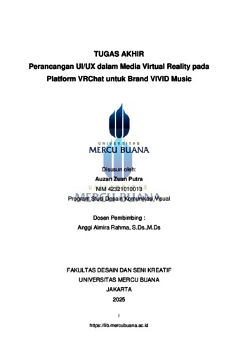 PUTRA, AUZAN ZUAN (2025) PERANCANGAN UI/UX DALAM MEDIA VIRTUAL REALITY PADA PLATFORM VRCHAT UNTUK BRAND VIVID MUSIC. S1 thesis, Universitas Mercu Buana.