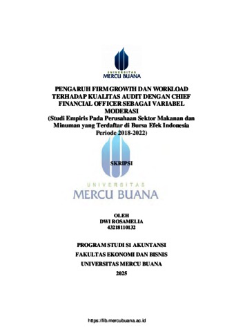 ROSAMELIA, DWI (2025) PENGARUH FIRM GROWTH DAN WORKLOAD TERHADAP KUALITAS AUDIT DENGAN CHIEF FINANCIAL OFFICER SEBAGAI VARIABEL MODERASI (Studi Empiris Pada Perusahaan Sektor Makanan dan Minuman yang Terdaftar di Bursa Efek Indonesia Periode 2018-2022). S1 thesis, Universitas Mercu Buana.