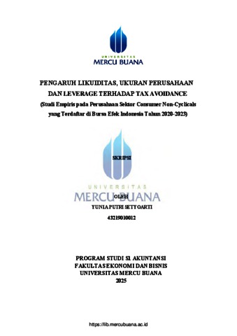 SETYOARTI, YUNIA PUTRI (2025) PENGARUH LIKUIDITAS, UKURAN PERUSAHAAN DAN LEVERAGE TERHADAP TAX AVOIDANCE (Studi Empiris pada Perusahaan Sektor Consumer Non-Cyclicals yang Terdaftar di Bursa Efek Indonesia Tahun 2020-2023). S1 thesis, Universitas Mercu Buana.