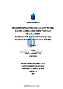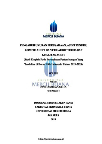 ANJELITA, NOVITASARI (2025) PENGARUH UKURAN PERUSAHAAN, AUDIT TENURE, KOMITE AUDIT DAN FEE AUDIT TERHADAP KUALITAS AUDIT (Studi Empiris Pada Perusahaan Pertambangan Yang Terdaftar di Bursa Efek Indonesia Tahun 2019-2023). S1 thesis, Universitas Mercu Buana.