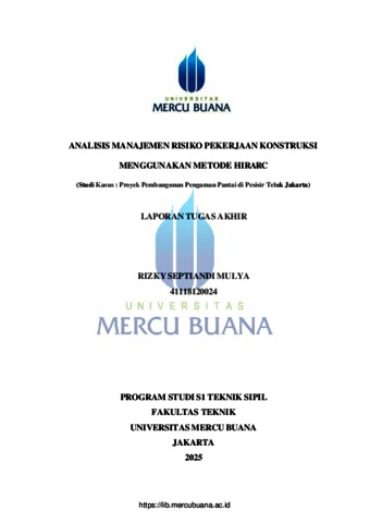 MULYA, RIZKY SEPTIANDI (2025) ANALISIS MANAJEMEN RISIKO PEKERJAAN KONSTRUKSI MENGGUNAKAN METODE HIRARC (Studi Kasus : Proyek Pembangunan Pengaman Pantai di Pesisir Teluk Jakarta). S1 thesis, Universitas Mercu Buana Jakarta.