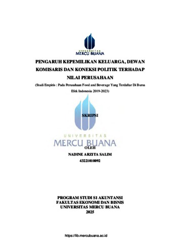 SALIM, NADINE ARZITA (2025) PENGARUH KEPEMILIKAN KELUARGA, DEWAN KOMISARIS DAN KONEKSI POLITIK TERHADAP NILAI PERUSAHAAN (Studi Empiris : Pada Perusahaan Food and Beverage Yang Terdaftar Di Bursa Efek Indonesia 2019-2023). S1 thesis, Universitas Mercu Buana.