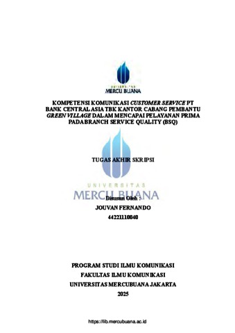 FERNANDO, JOUVAN (2025) KOMPETENSI KOMUNIKASI CUSTOMER SERVICE PT BANK CENTRAL ASIA TBK KANTOR CABANG PEMBANTU GREEN VILLAGE DALAM MENCAPAI PELAYANAN PRIMA PADA BRANCH SERVICE QUALITY (BSQ). S1 thesis, Universitas Mercu Buana.